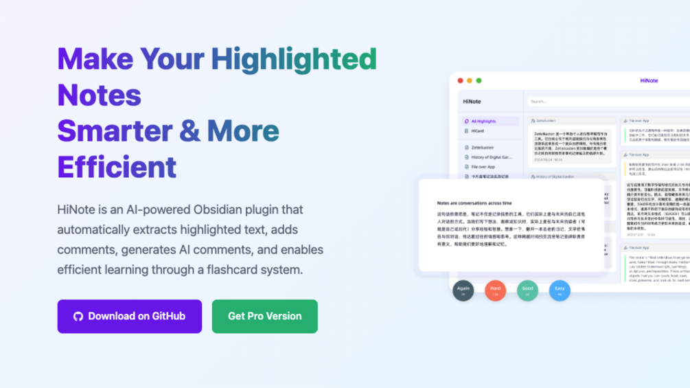 HiNote is an AI-powered Obsidian plugin that automatically extracts highlighted text, adds comments, generates AI comments, and enables efficient learning through a flashcard system.